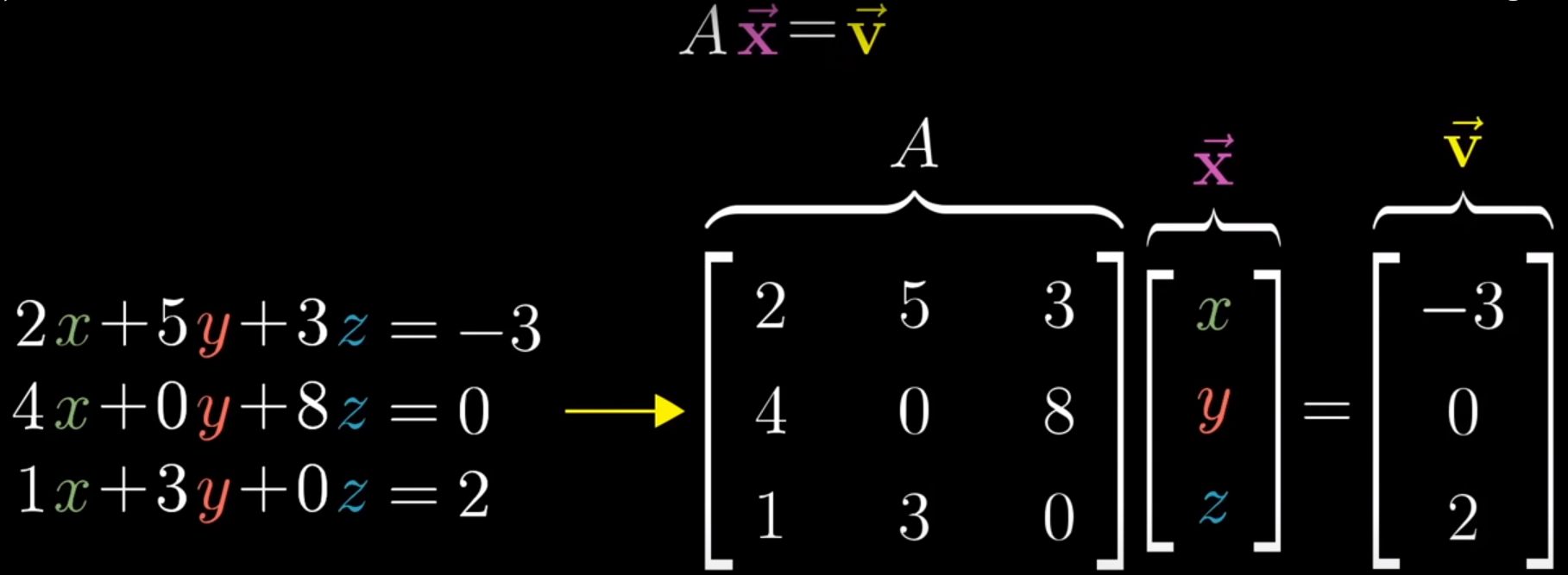 0이 아닌 경우 위 식을 통해 x, y, z를 손쉽게 구할 수 있는데 이는 A벡터에 다른 벡터를 곱했을 때 나올 수 있는 벡터는 v벡터 하나이다. 이 변환을 역방향으로 돌리면 x벡터를 찾을 수 있다.